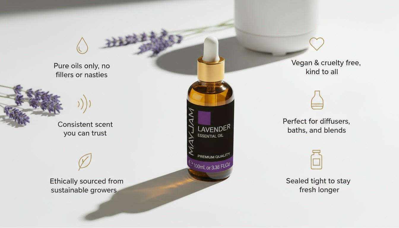 More oil, more calm. Mayjam’s 30ml essential oil bottle offers 100% pure, natural scent for diffusers, humidifiers, or massage blends. A larger size that delivers long-lasting fragrance and everyday relaxation. Ideal for home or professional aromatherapy use.